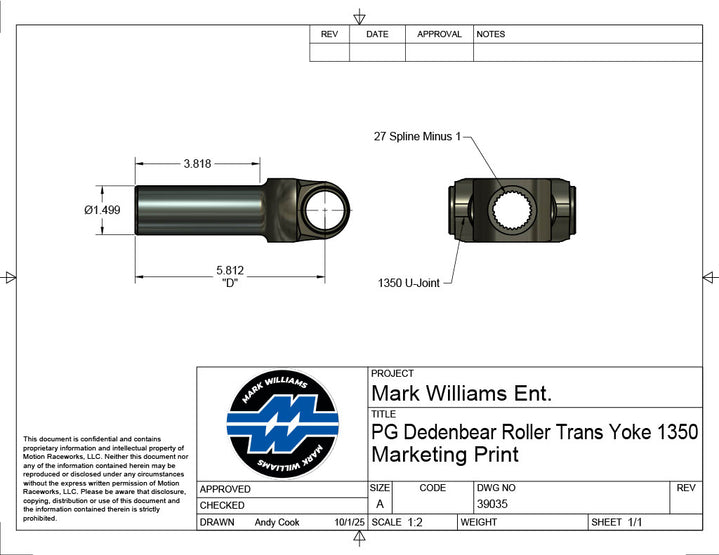 Mark Williams transmission slip yokes are machined from high strength 4340 steel and thru hardened in house for ultimate strength. All machining is done in relationship to the spline pitch diameter to ensure each yoke is symmetrical for balance and smooth operation.